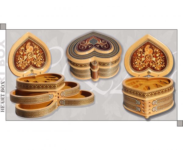 Presenting the Dicentra Box, a true marvel in the realm of treasures. This limited edition Marquetry Heart Box exemplifies our dedication to marrying traditional shape with Traditional Khatam and Marquetry.