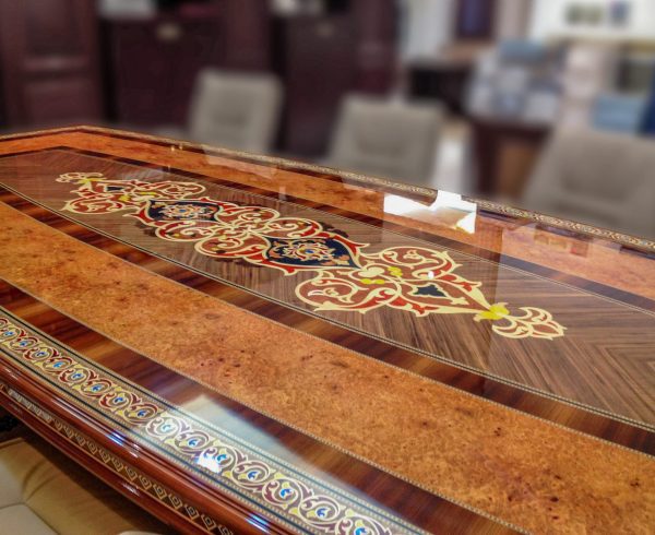 The Jasminea Meeting Table is a testament to our commitment to artistic craftsmanship, featuring a stunning marquetry design with a rich variety of natural veneers and exquisite mother-of-pearl inlays. Each table is a bespoke masterpiece, offering customization in both design and size.